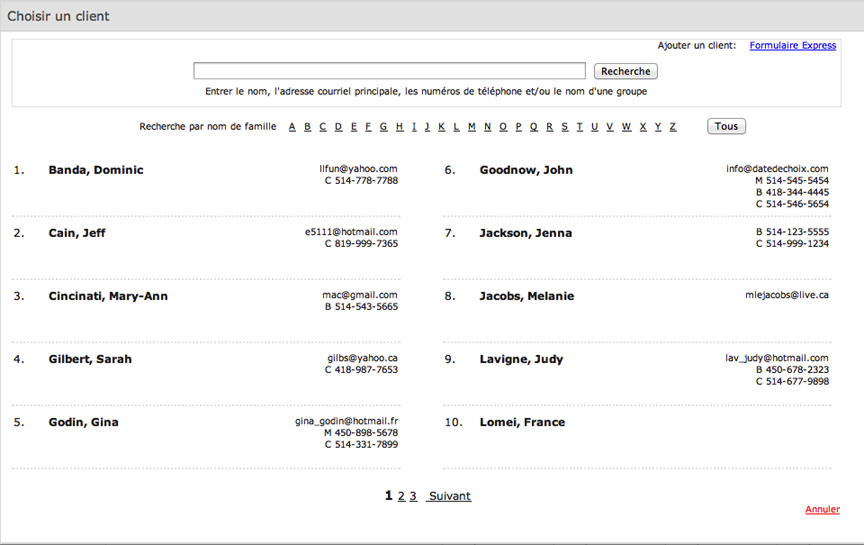 réservé. Vous pouvez faire une recherche par prénom, nom de famille, courriel, numéro de téléphone ou groupe,
